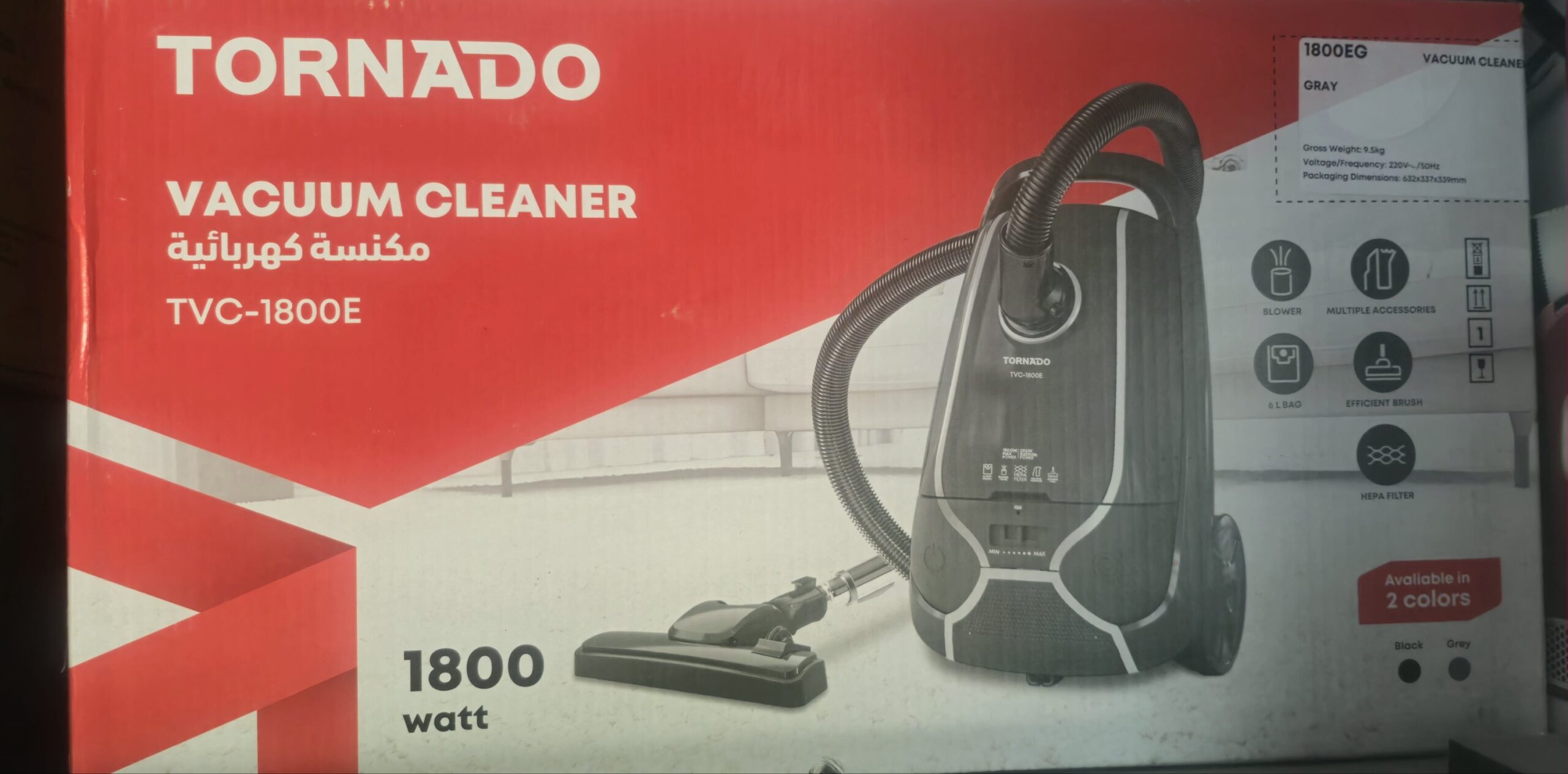 مكنسة كهربائية تورنيدو بفلتر مضاد للبكتيريا، 1800 وات، اسود رمادي TVC-1800E